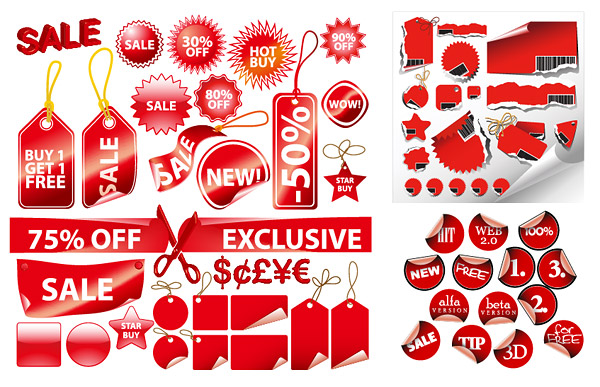 eps format, including jpg preview, keyword: Vector tag, label, label, red, sales, discounts, shopping, Scissors, sale, money symbols, circular, gear-shaped angle, roll angle, tearing, web design, new, free, web2.0, vector material